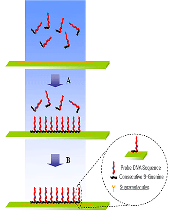 9G OligoDNA’s approach and are immobilized on 9G Chip in 1~4hrs. The remaining Oligomers are washed away to leave only immobilized ones on the defined area of the chip.